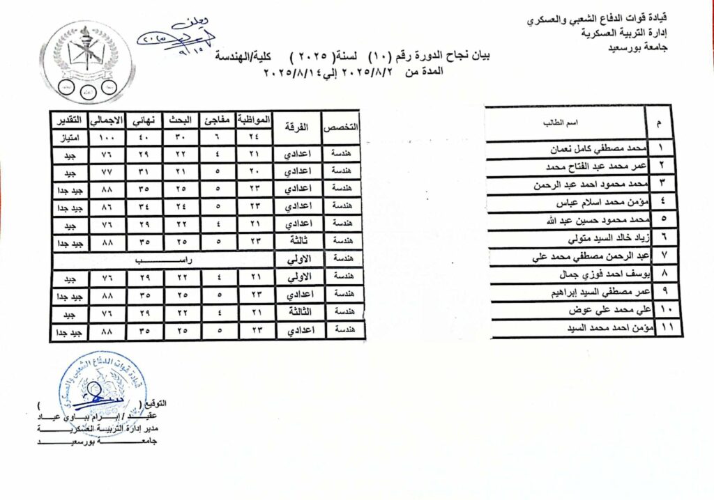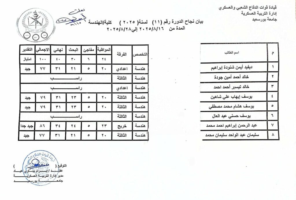 بيان نجاح التربية العسكرية عن المدة من 2-8-2025 الى 28-8-2025