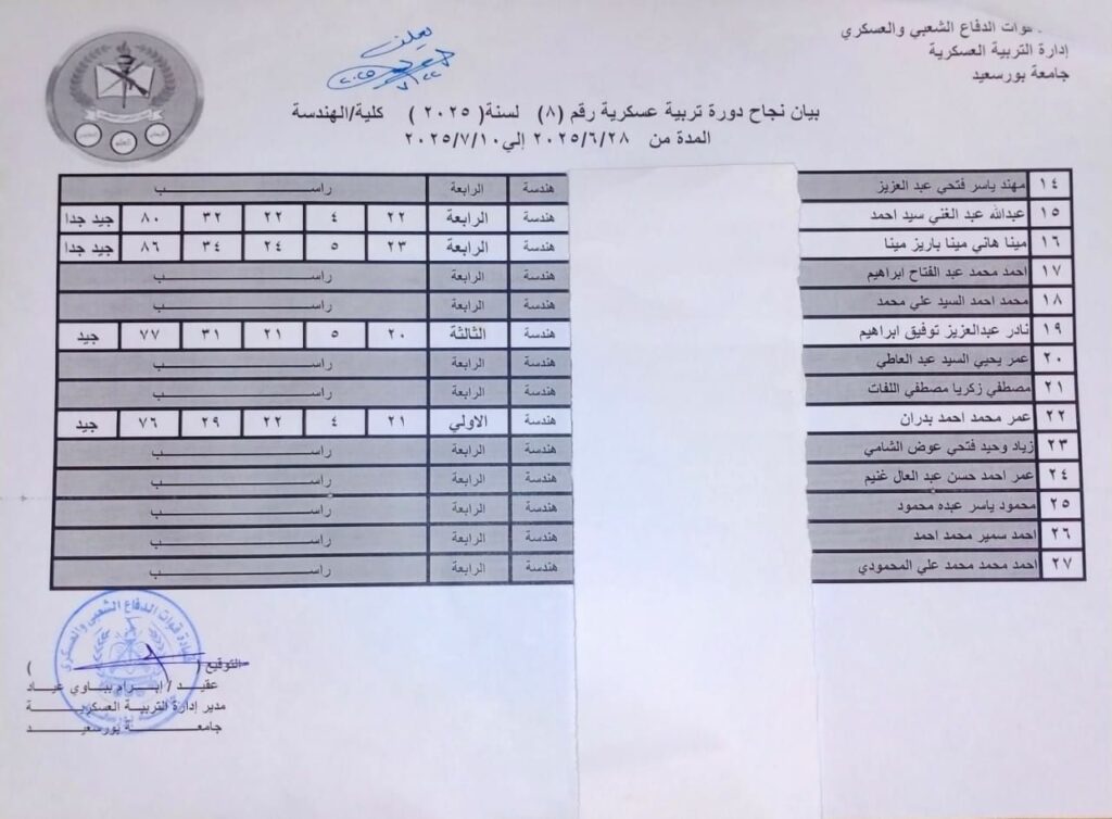 بيان نجاح تربية عسكرية عن المدة من 28-6-2025 الى 10-7-2025